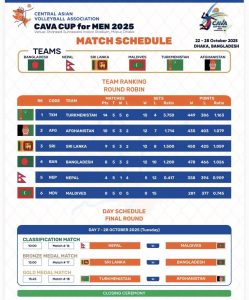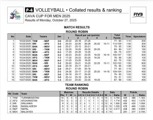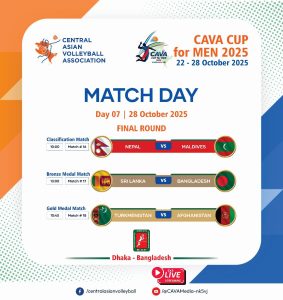 Dhaka, Bangladesh, October 27, 2025 – The sixth day of the CAVA Cup for Men 2025 served up a feast of volleyball drama at the Shaheed Suhrawardi Indoor Stadium in Mirpur, Dhaka. With the tournament approaching its grand finale, the intensity soared and emotions ran high as fans erupted in cheers from the stands to witness three thrilling encounters – each telling its own story of precision, redemption, and surprise.