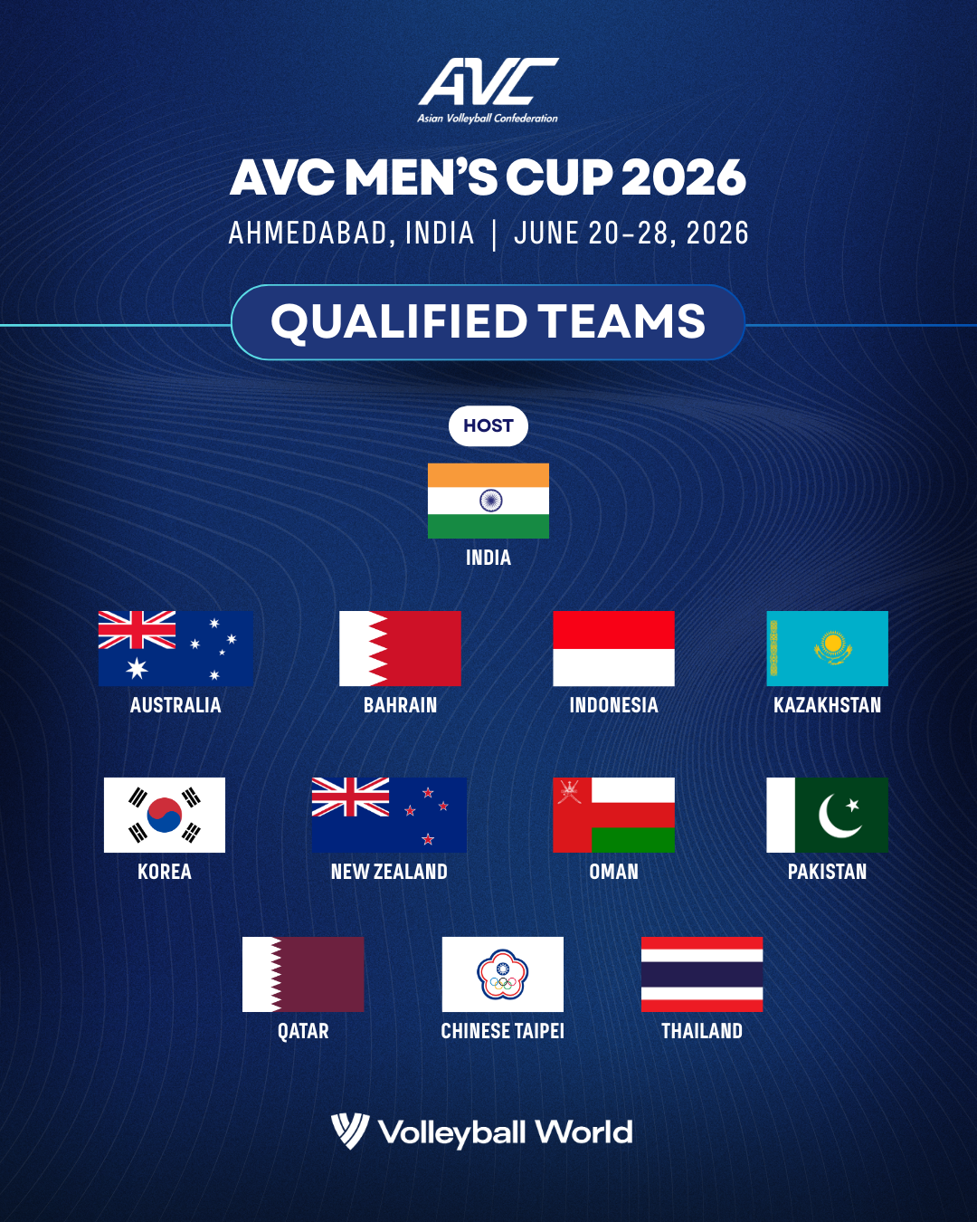 The Asian Volleyball Confederation (AVC) has officially confirmed the qualified teams for the AVC Women’s Cup 2026 and AVC Men’s Cup 2026, completing the lineup for two of the continent’s premier national team competitions scheduled for June.
