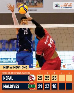In the afternoon, Nepal stepped onto the court determined to turn the page after two hard-fought losses – and they did so emphatically. From the opening whistle, Nepal seized control of the contest, with Dhan Bahadur Bhatta and Pahal Gahatraj spearheading a sharp and fluid offensive display. Setter Harihajur Thapa ran the show with authority, keeping the Maldivian defence constantly on the move.
