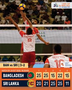Bangladesh outlasted Sri Lanka in five-set thriller 3–2 (25–20, 25–21, 20–25, 23–25, 15–11)